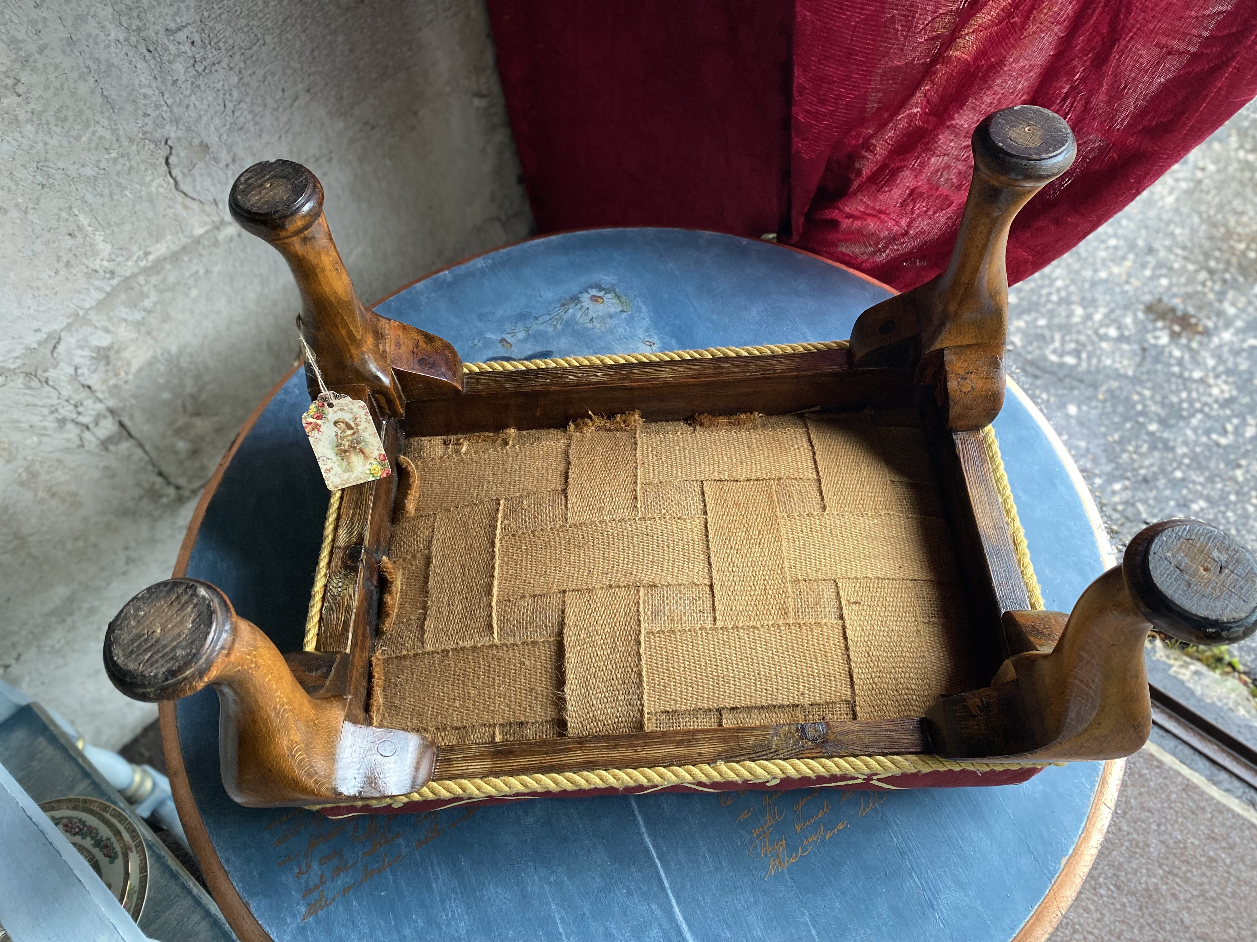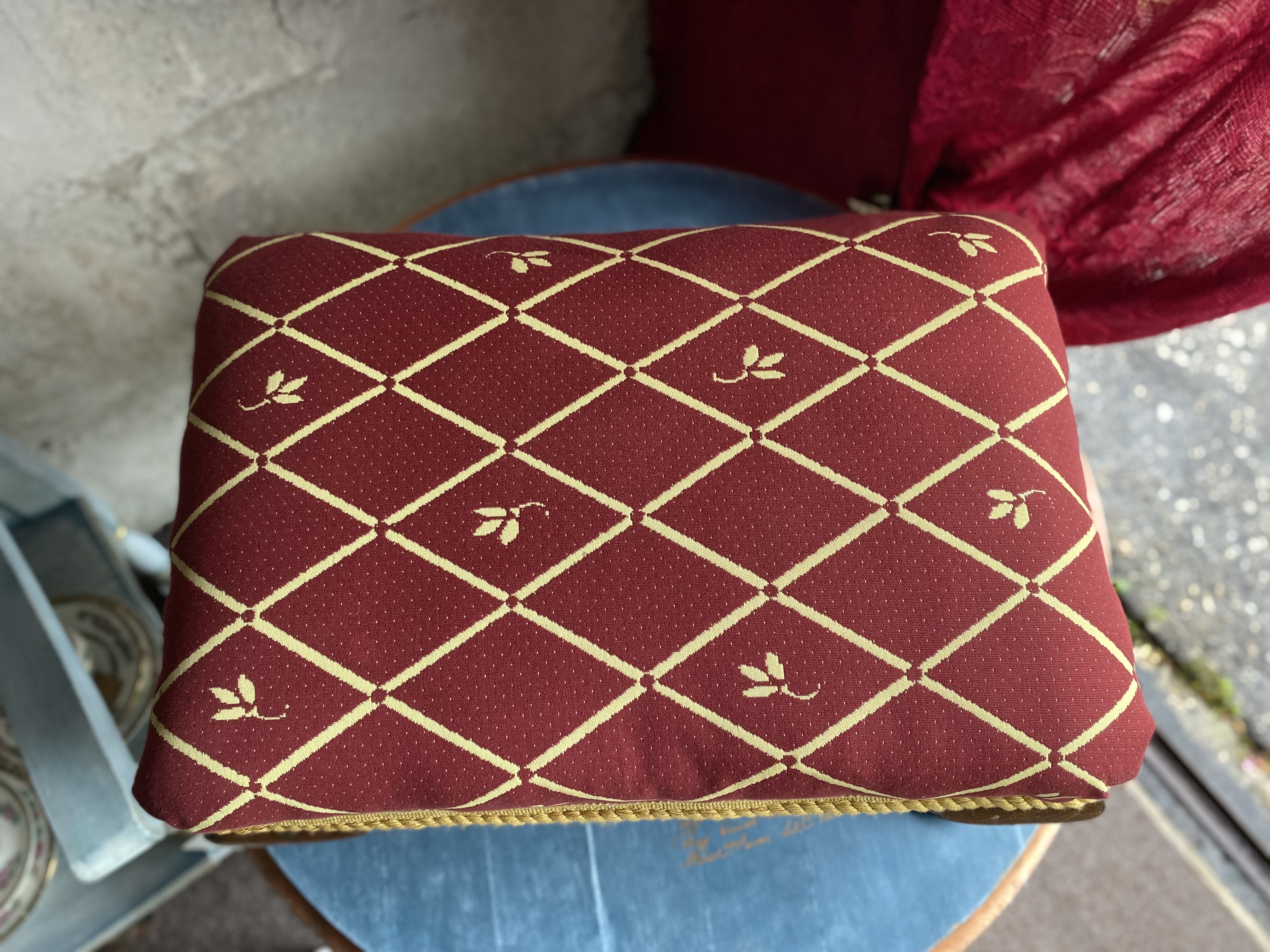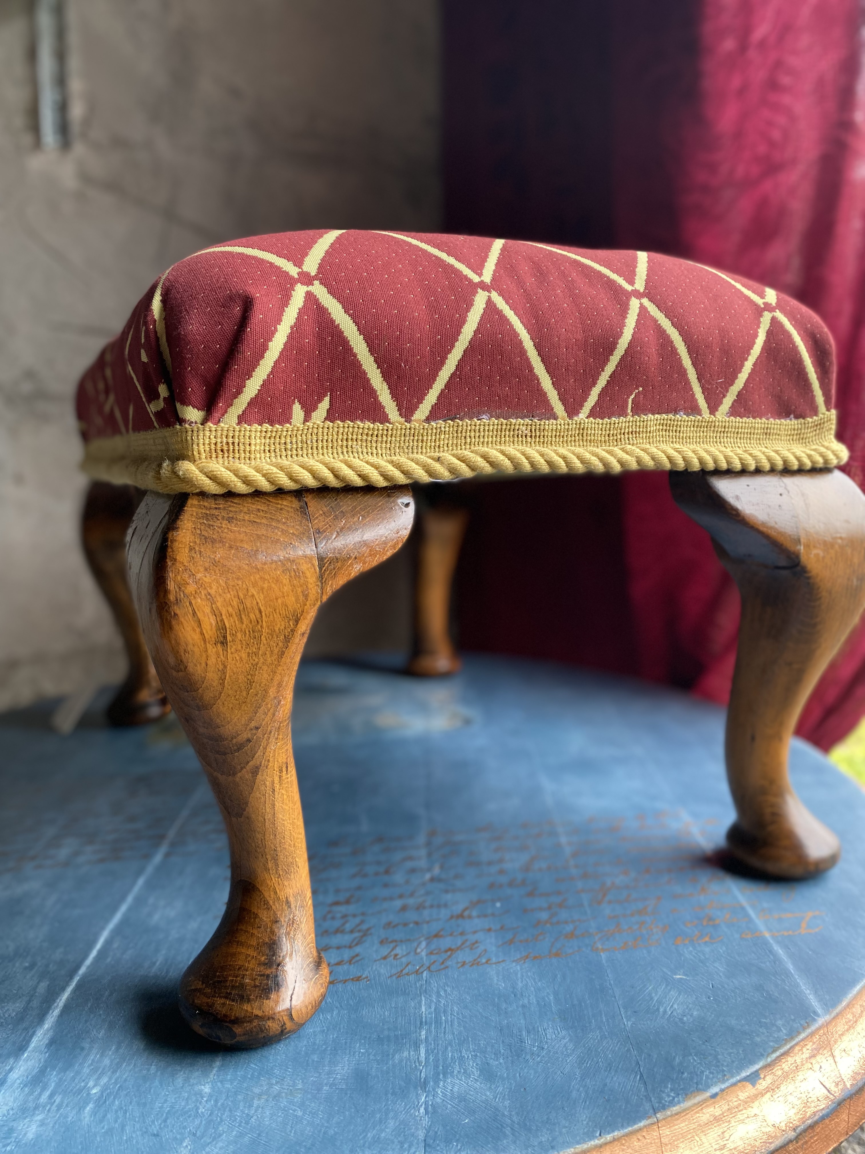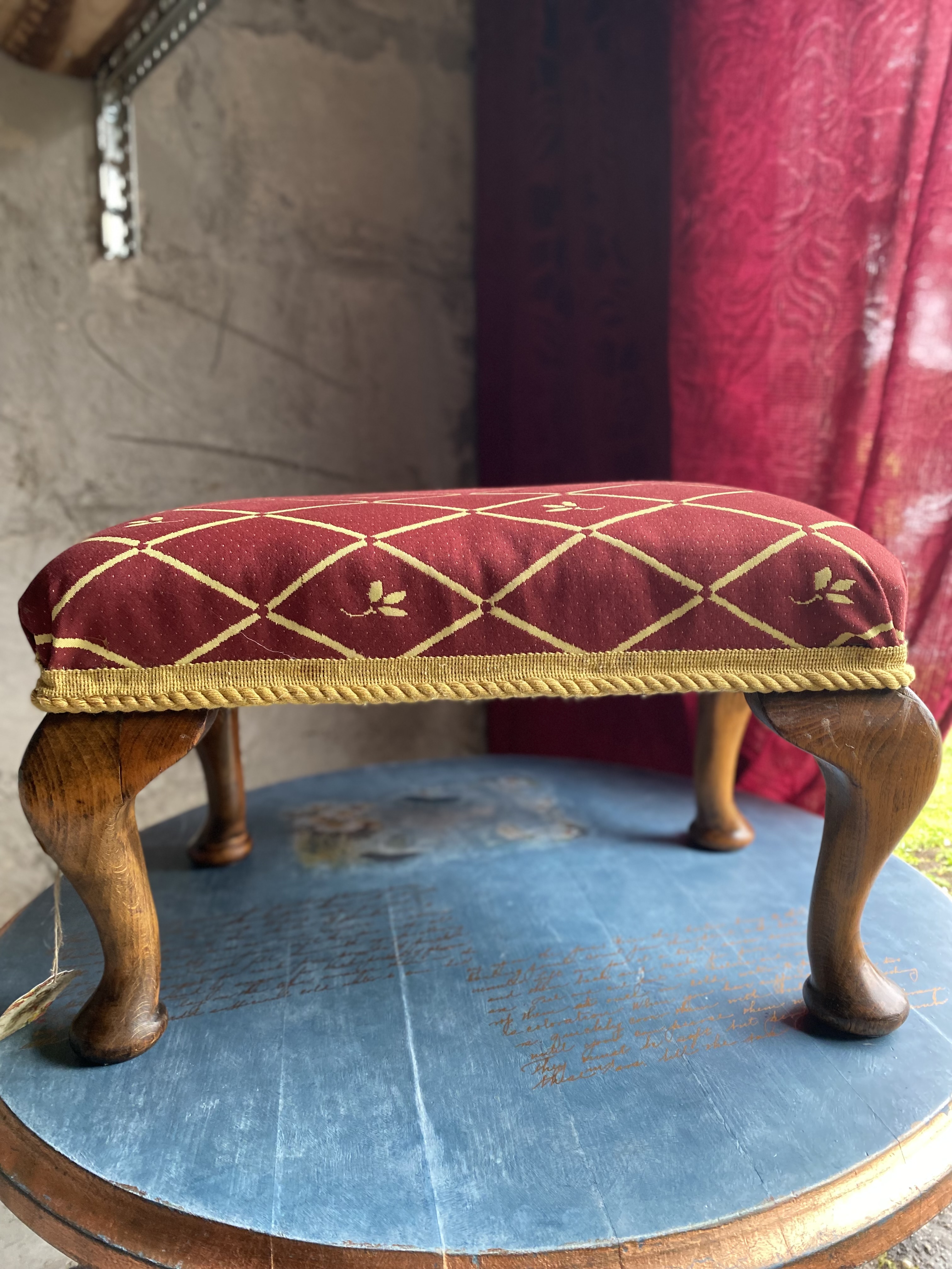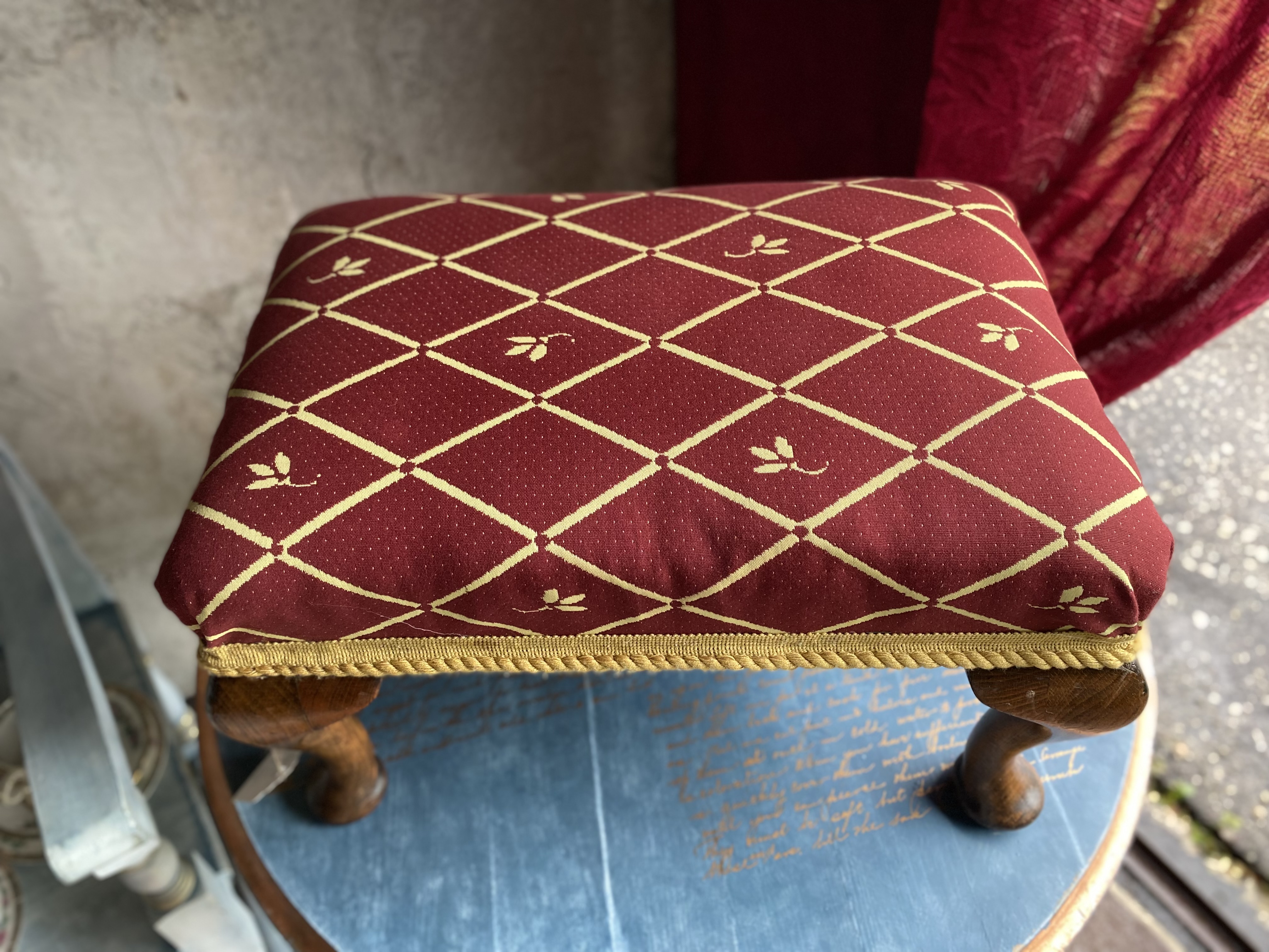 Sooja tooniga puitraam on käsitsi viimistletud ning kaetud luksusliku kangaga, millel on kuldsed rombid ja väikesed lillemotiivid. Kuldne nöör servas lisab viimase viimistletud lihvi. Algselt mõeldud toaletilaua juurde või salongi istmeks, sobib see jalapink täna ideaalselt jalatoeks, lisatooliks või aktsentmööbliks igasse klassikalisse või eklektilisse koju.