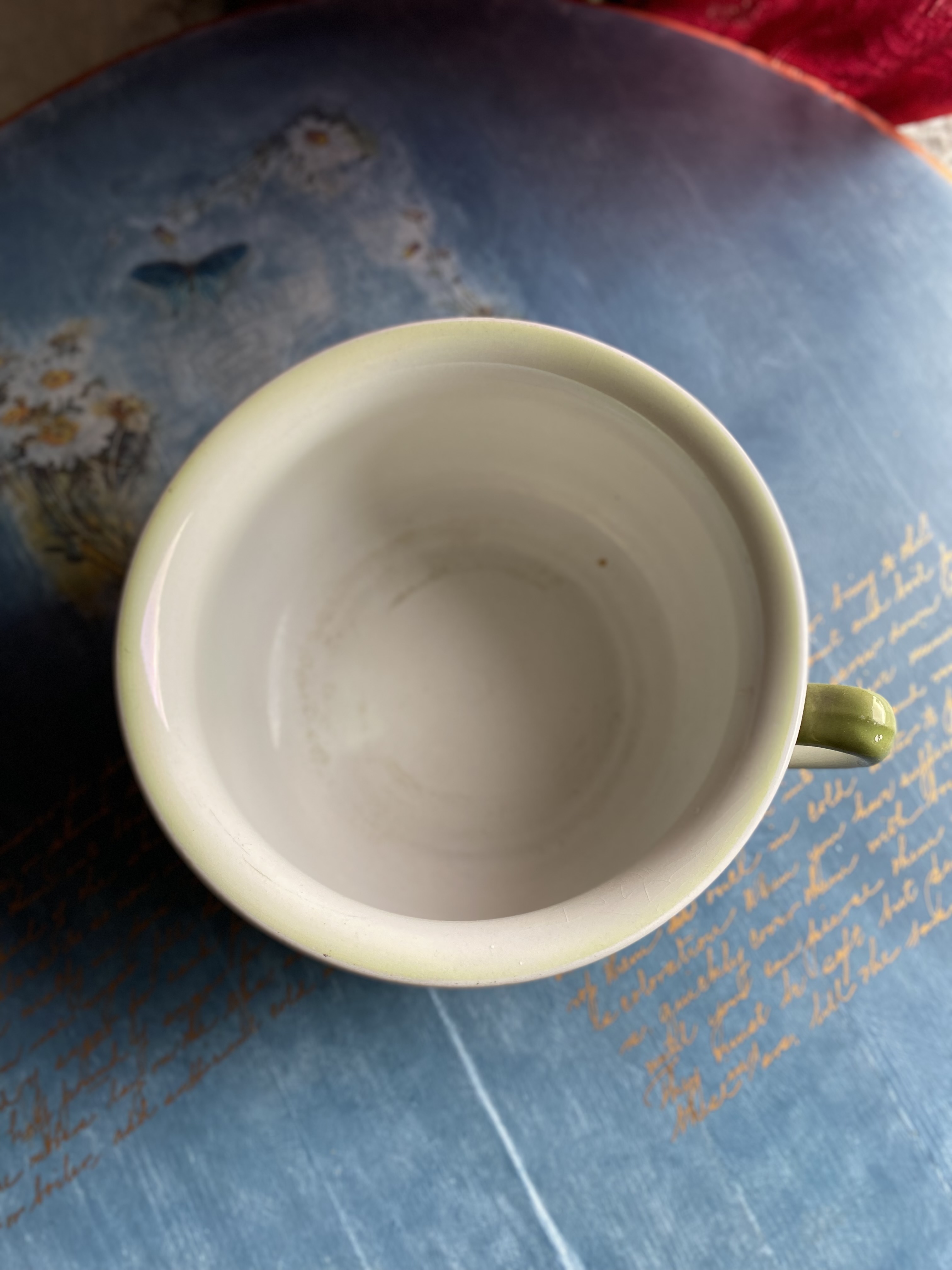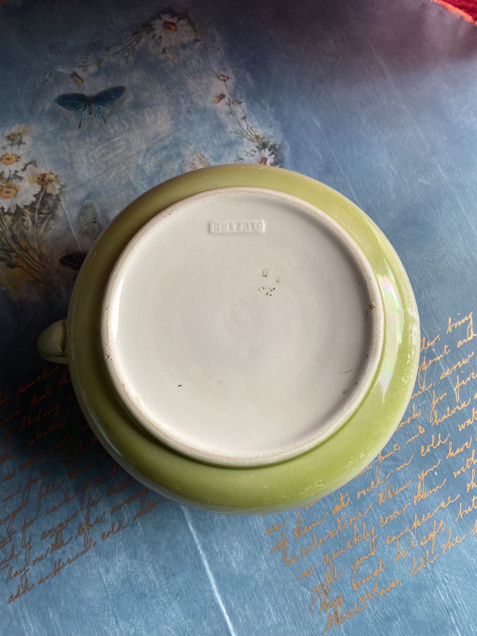 Kaunis ja dekoratiivne vintage potikann, kaunistatud roosimustri ja õrna rohelise glasuuriga. Põhjal “DELPHIC” tähis – pärit tõenäoliselt 1930.–50. aastatest. Algne otstarve oli praktiline, kuid tänapäeval sobib see suurepäraselt maalähedaseks sisustuselemendiks või lillepotiks.