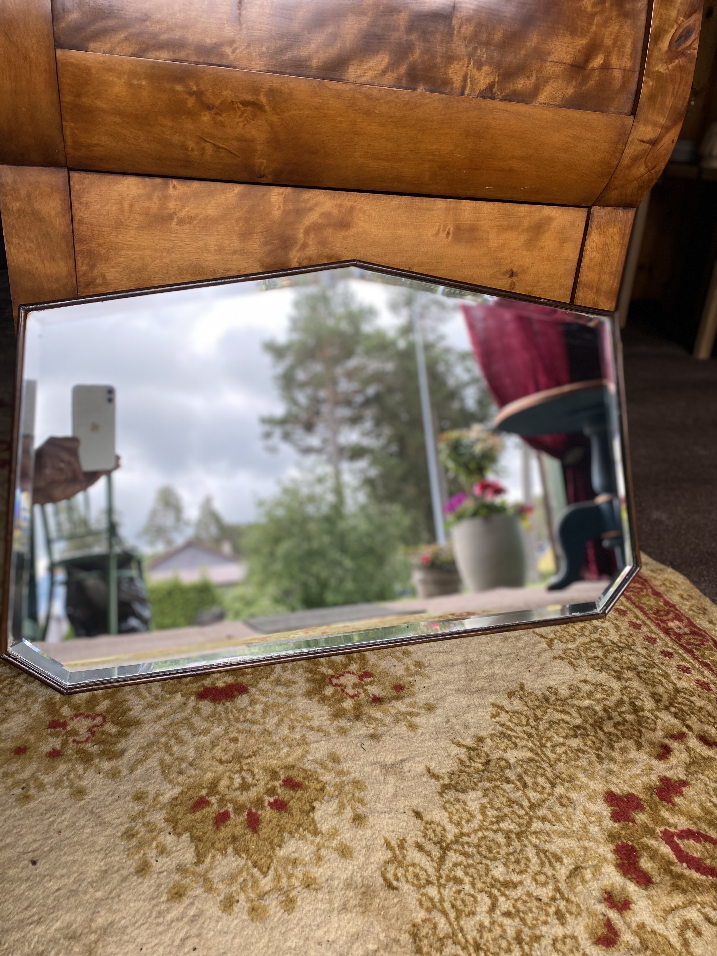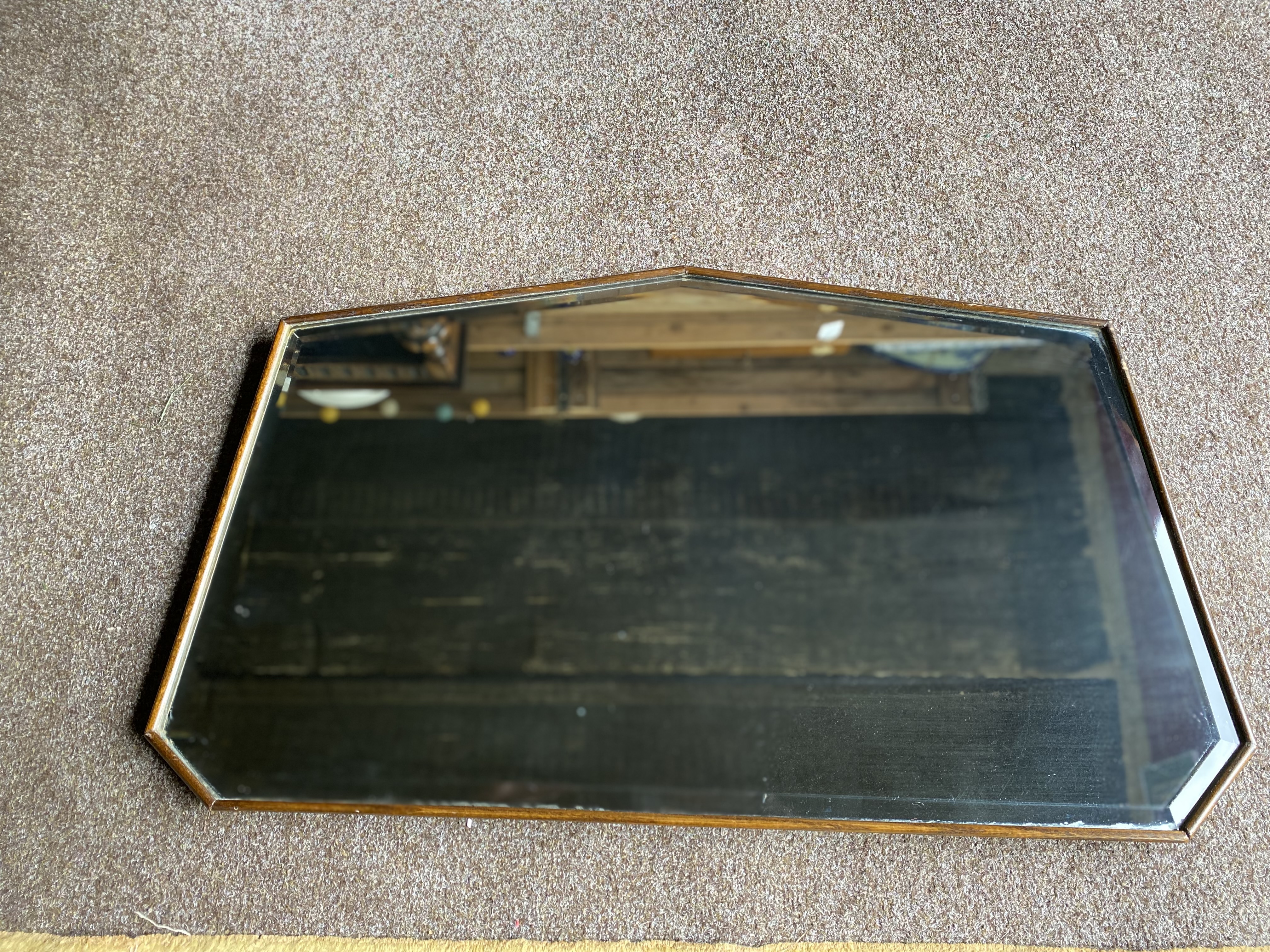 Kaunis ja stiilne originaalne Art déco seinapeegel, pärit 20. sajandi keskpaigast. Peeglil on omapärane geomeetriline kuju koos faasitud äärega. Tagakülg on minimalistlikust puidust ning varustatud originaalse messingist riputusketiga. Sobib hästi vintage- või retrostiilis interjööri.