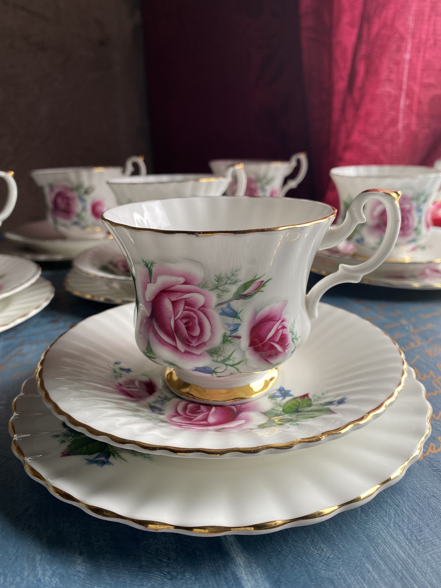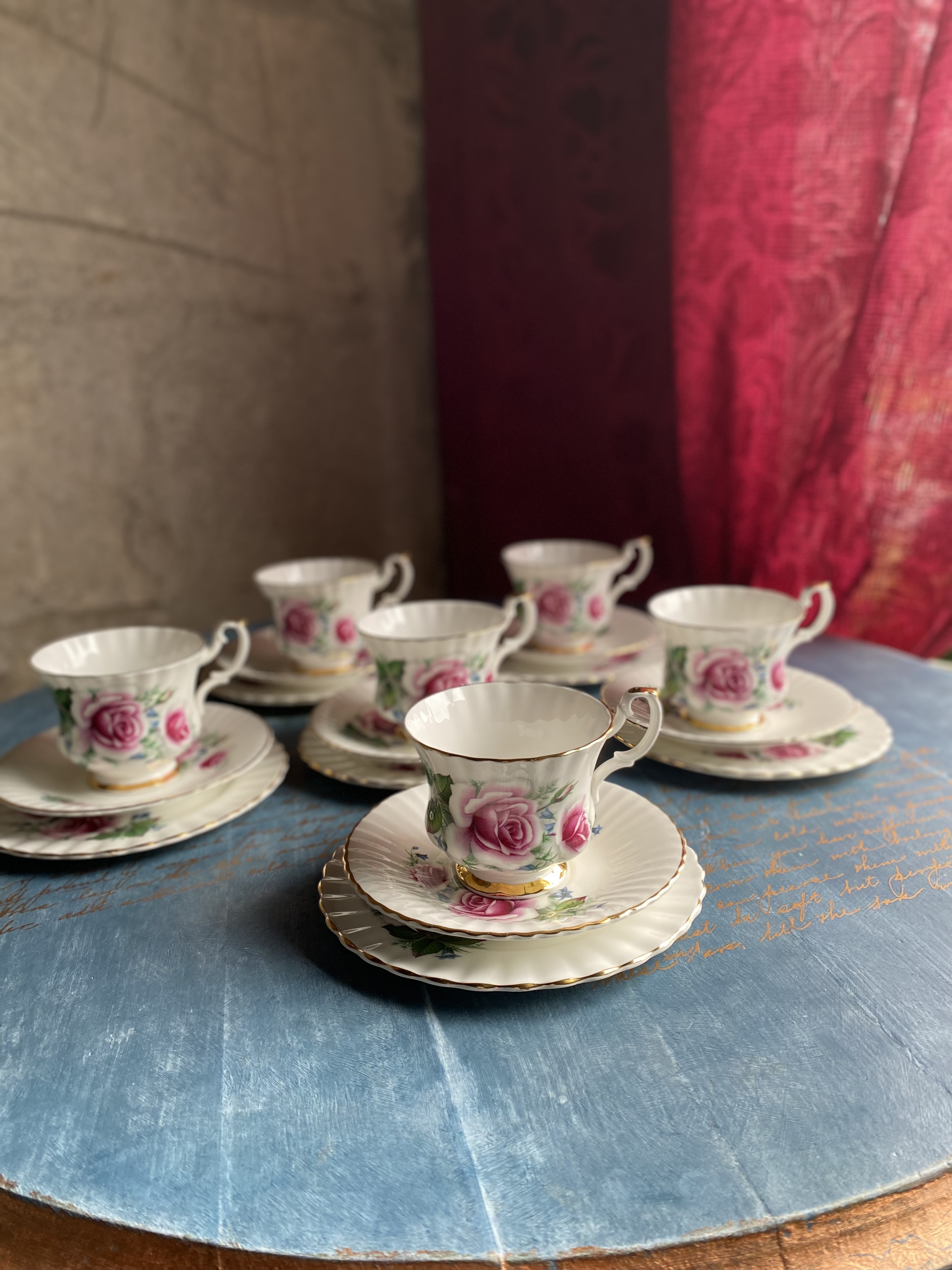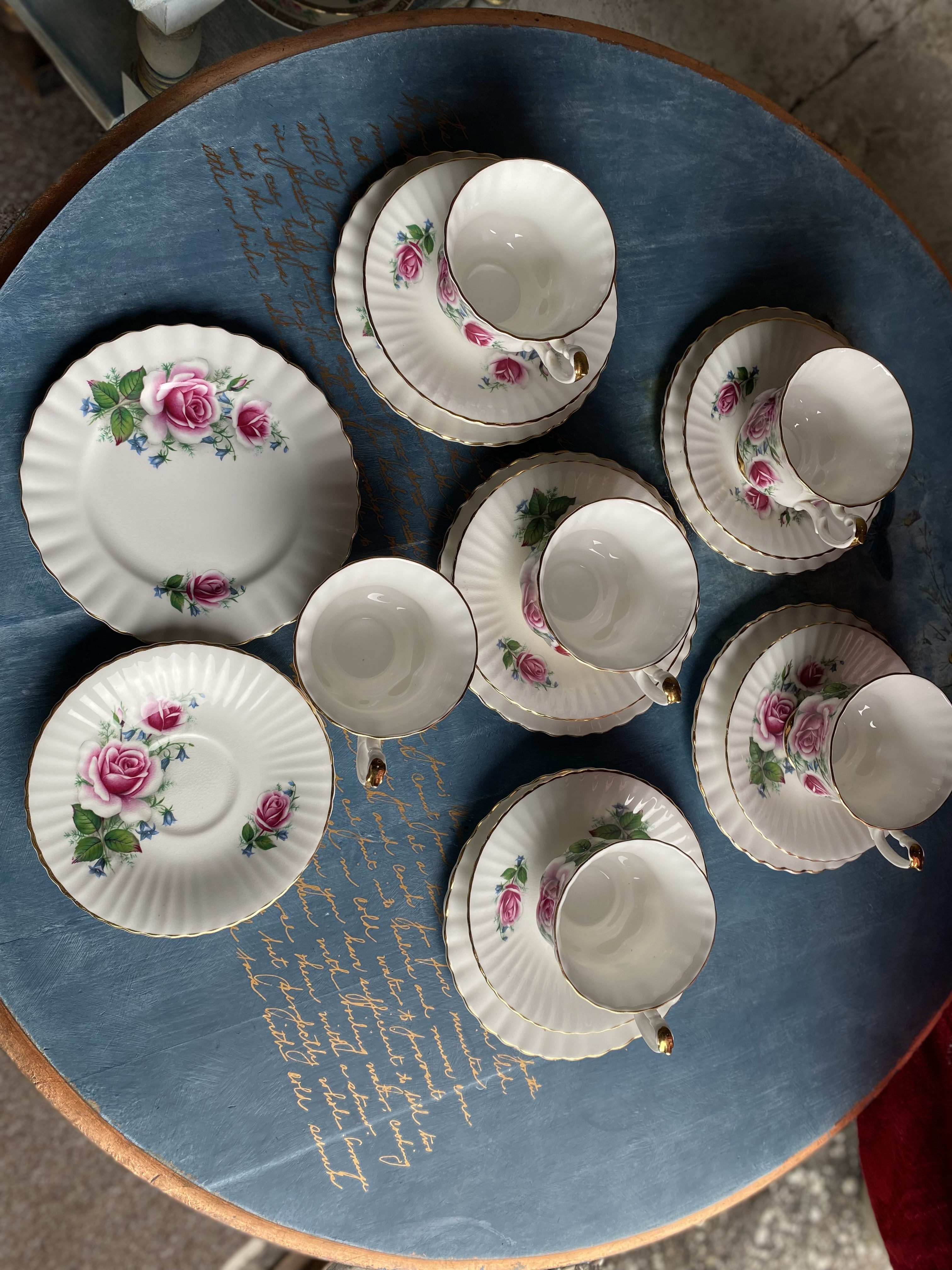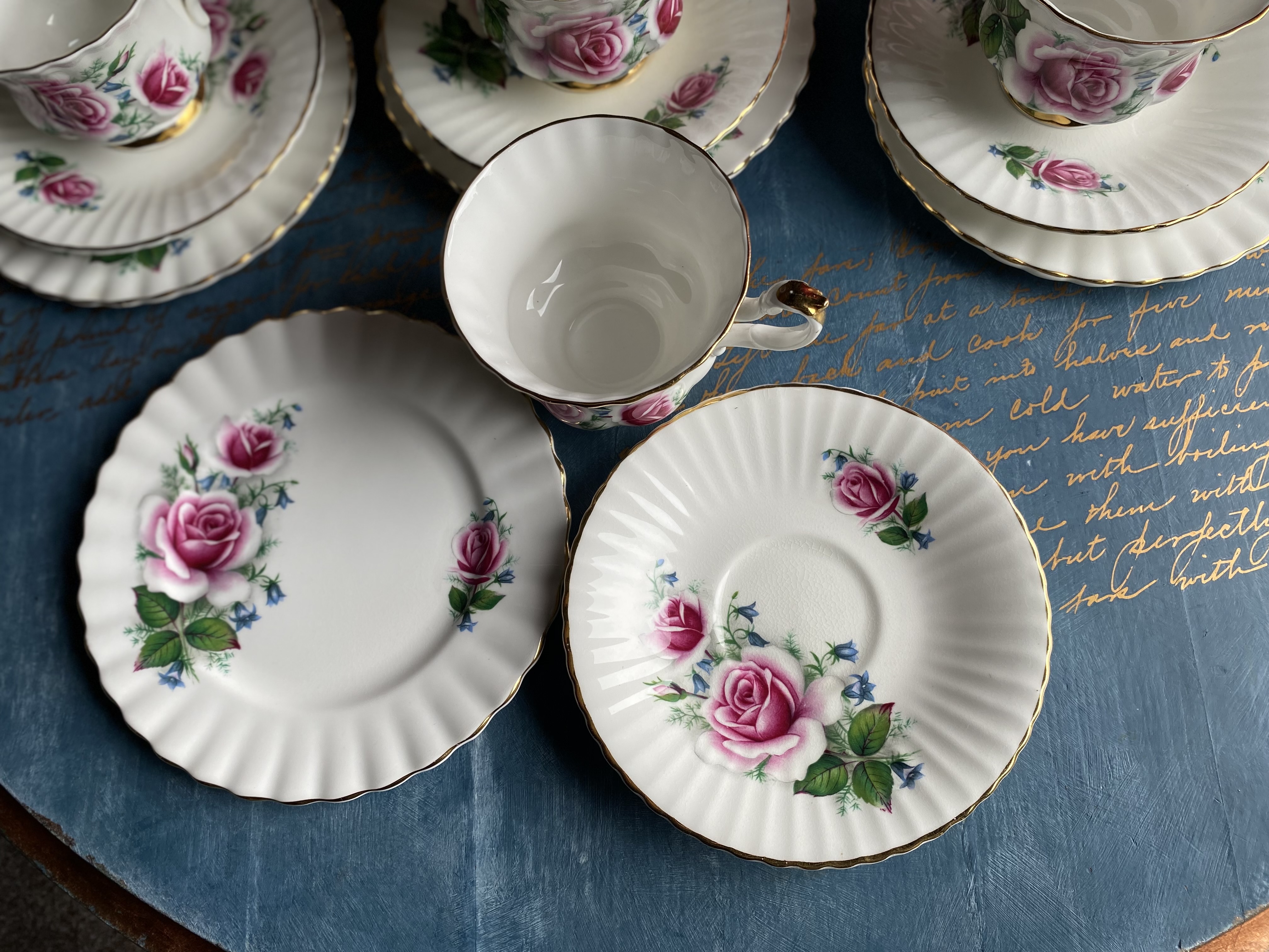 Klassikalise Inglise elegantsiga Royal Imperial teekomplekt, valmistatud Inglismaal Staffordshire’is. Kaunistatud roosade rooside, väikeste siniste õitega ja käsitsi kantud kuldse äärega. Reljeefse servaga taldrikud ja tassid.