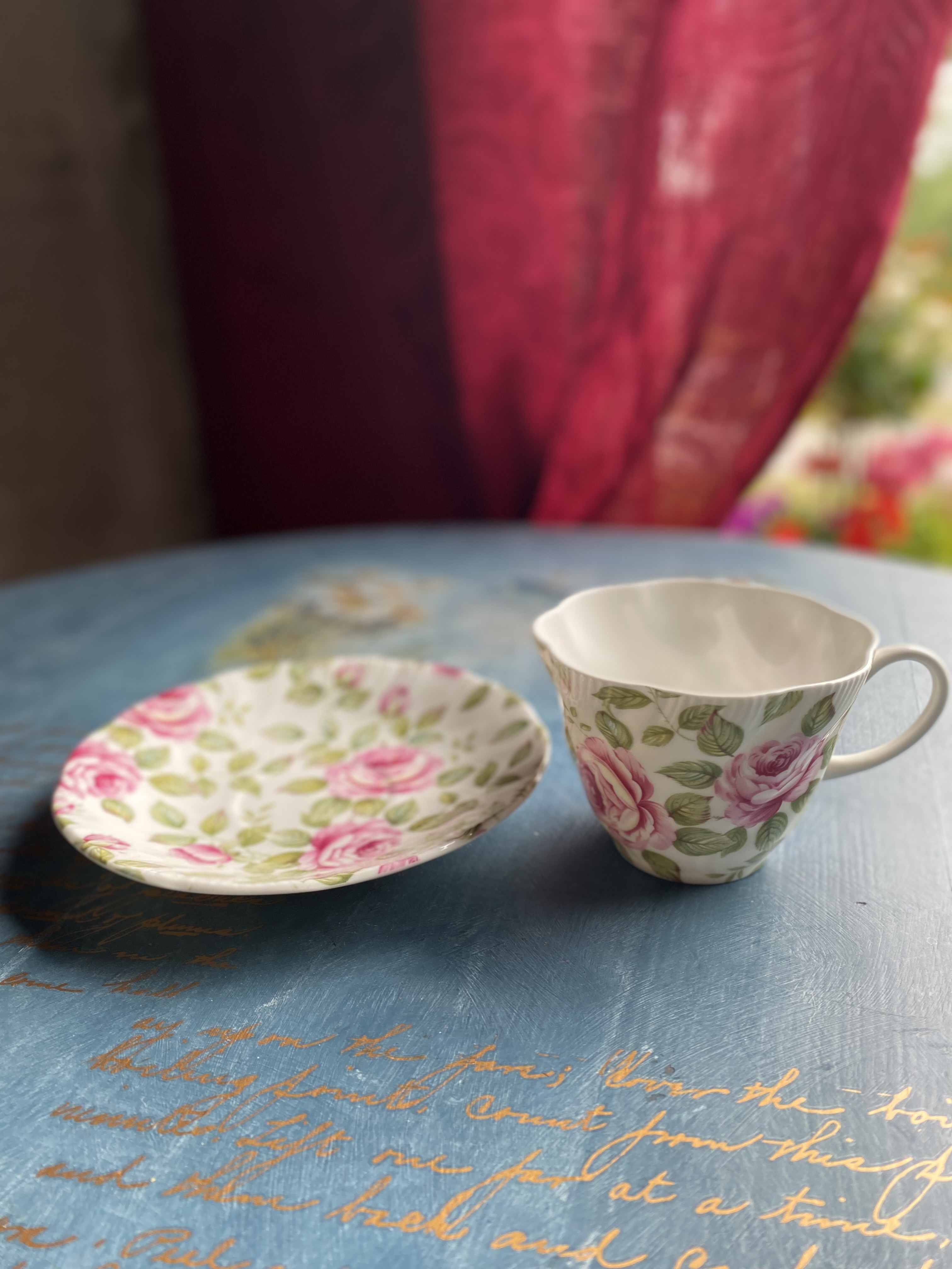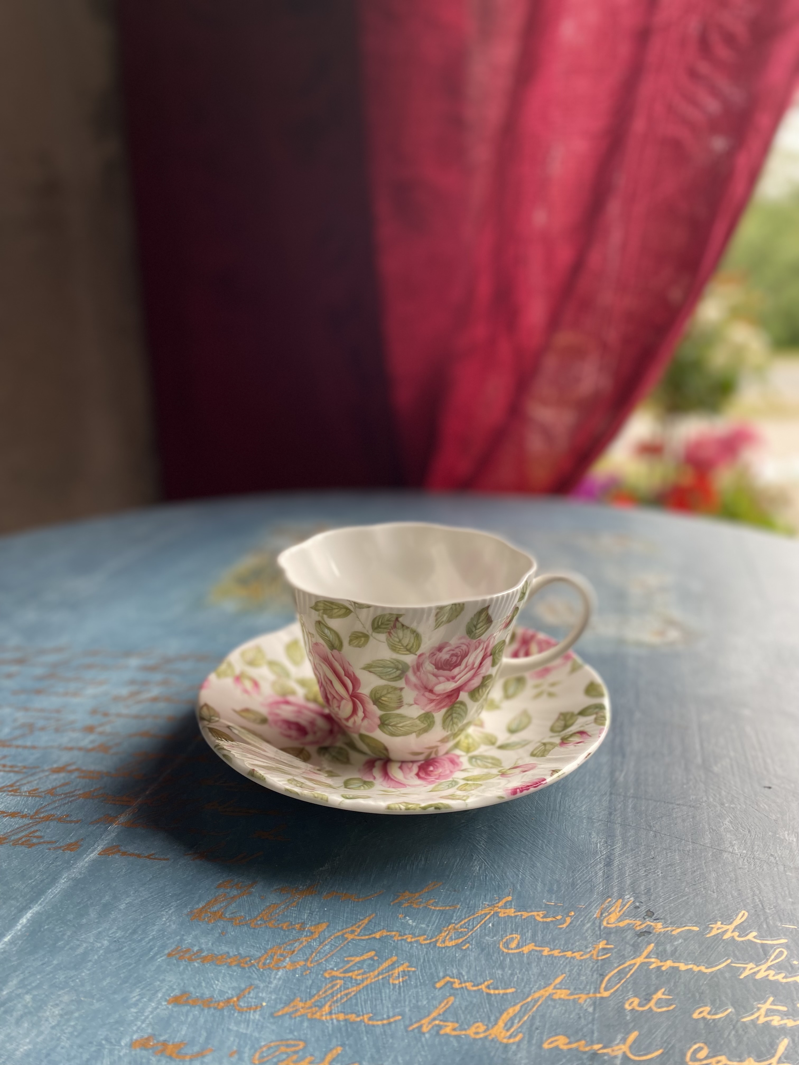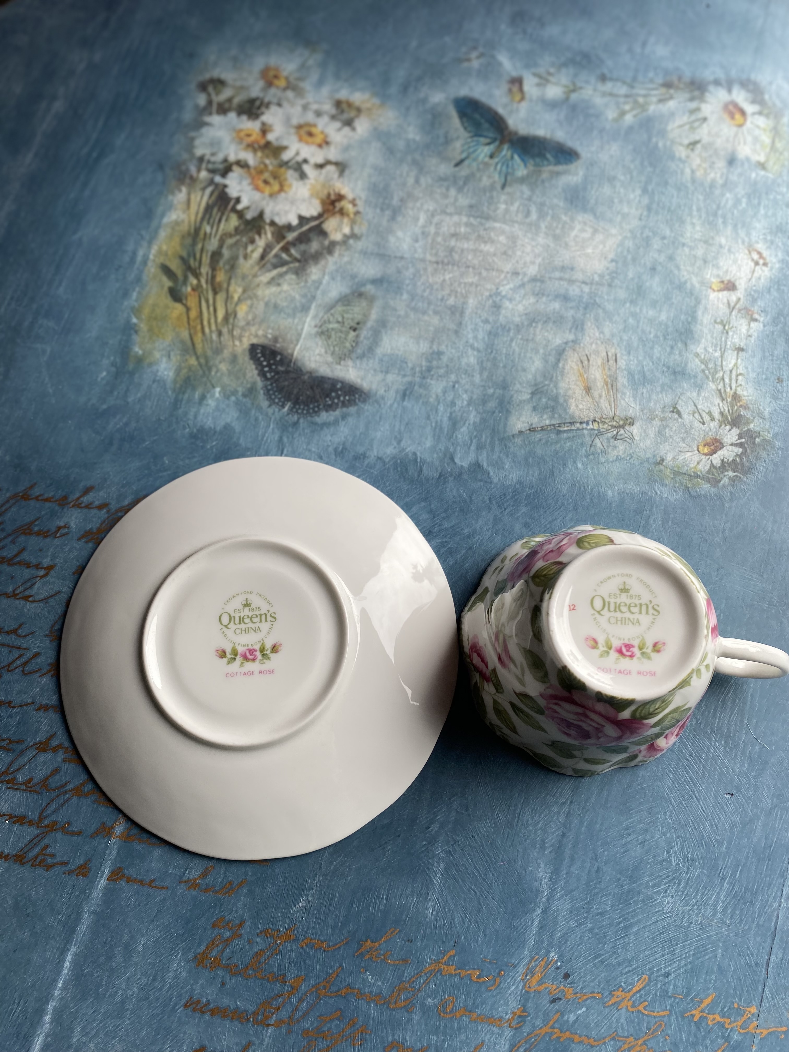 Elegantne Queen’s China “Cottage Rose” tee-tassi ja alustassi komplekt – Inglise portselan
