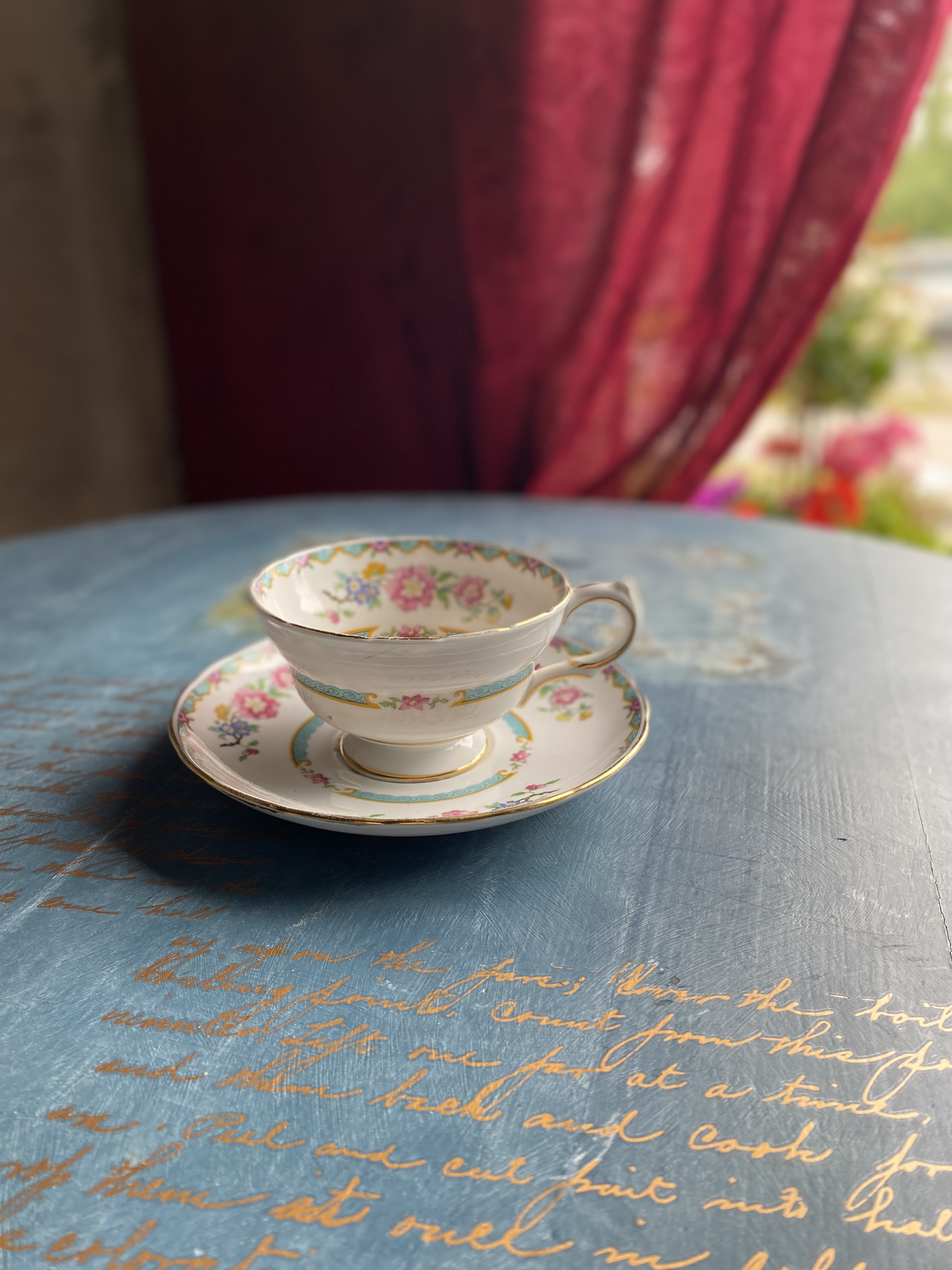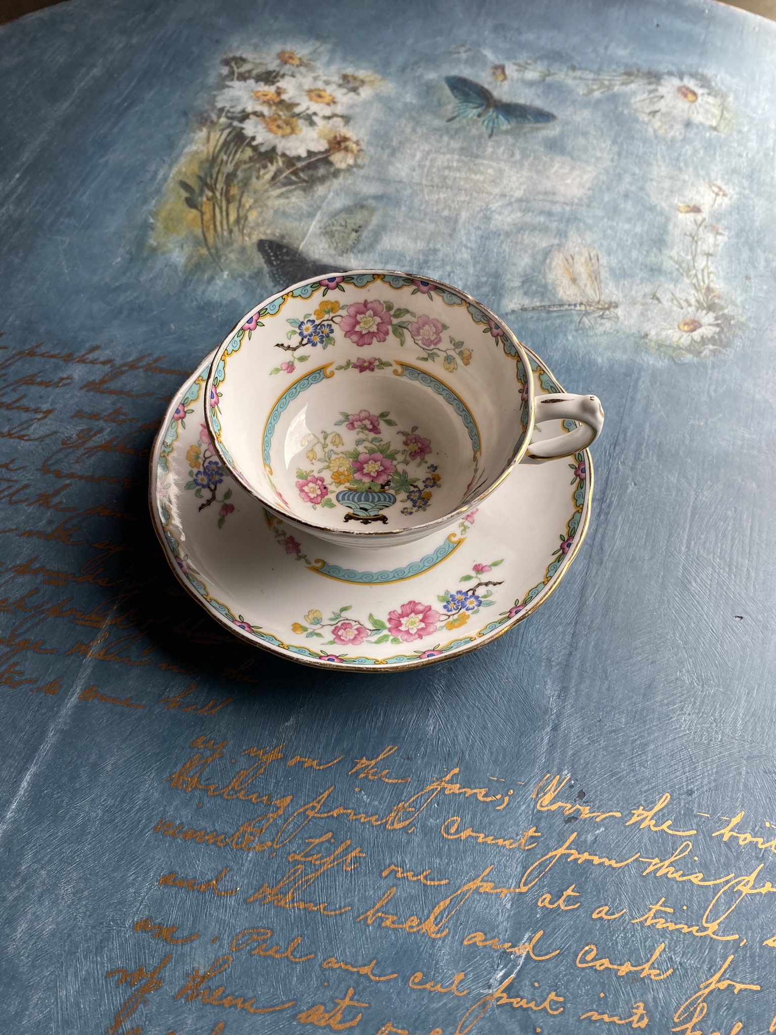 Lisa oma teejoomisele ajatut elegantsi selle kauni vintage teetassi ja alustassi komplektiga, mille on valmistanud Grosvenor China Inglismaal. “Wu Ting” muster on idamaisest stiilist inspireeritud, keskmes türkiissinine vaas lilledega, kuldne ääristus ja värvikas ornamentidega kaunistus.