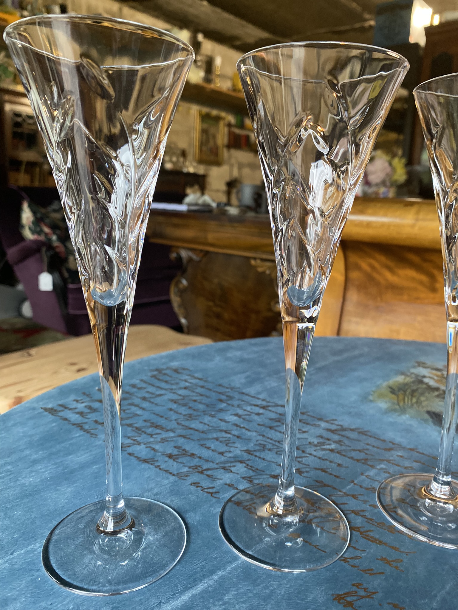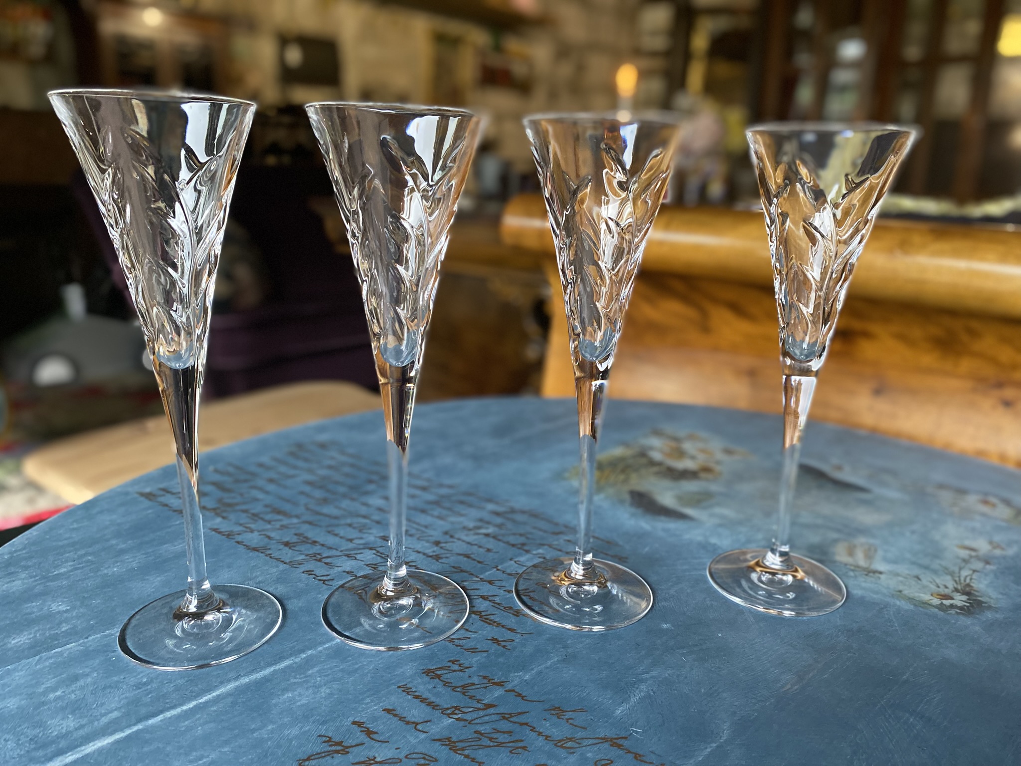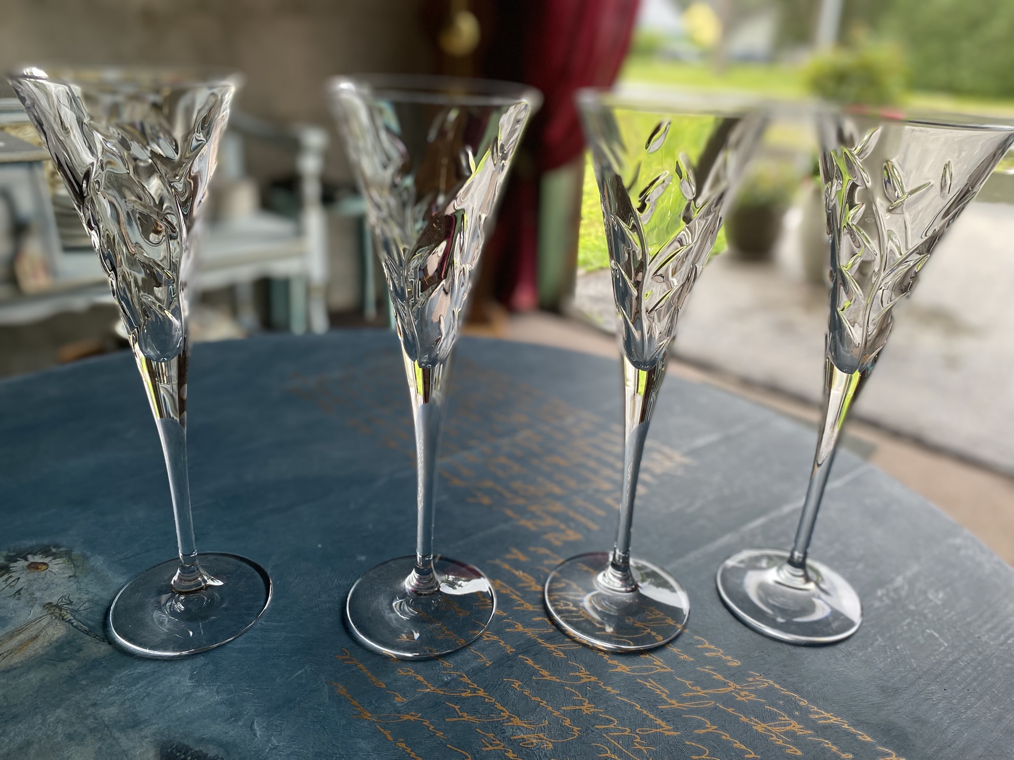 Kaunis komplekt 4-st vintage šampanjaklaasist, valmistatud kvaliteetsest lõigatud kristallist. Igal klaasil on peenelt graveeritud lehemuster, mis särab valguses – iseloomulik tõelisele pliikristallile.