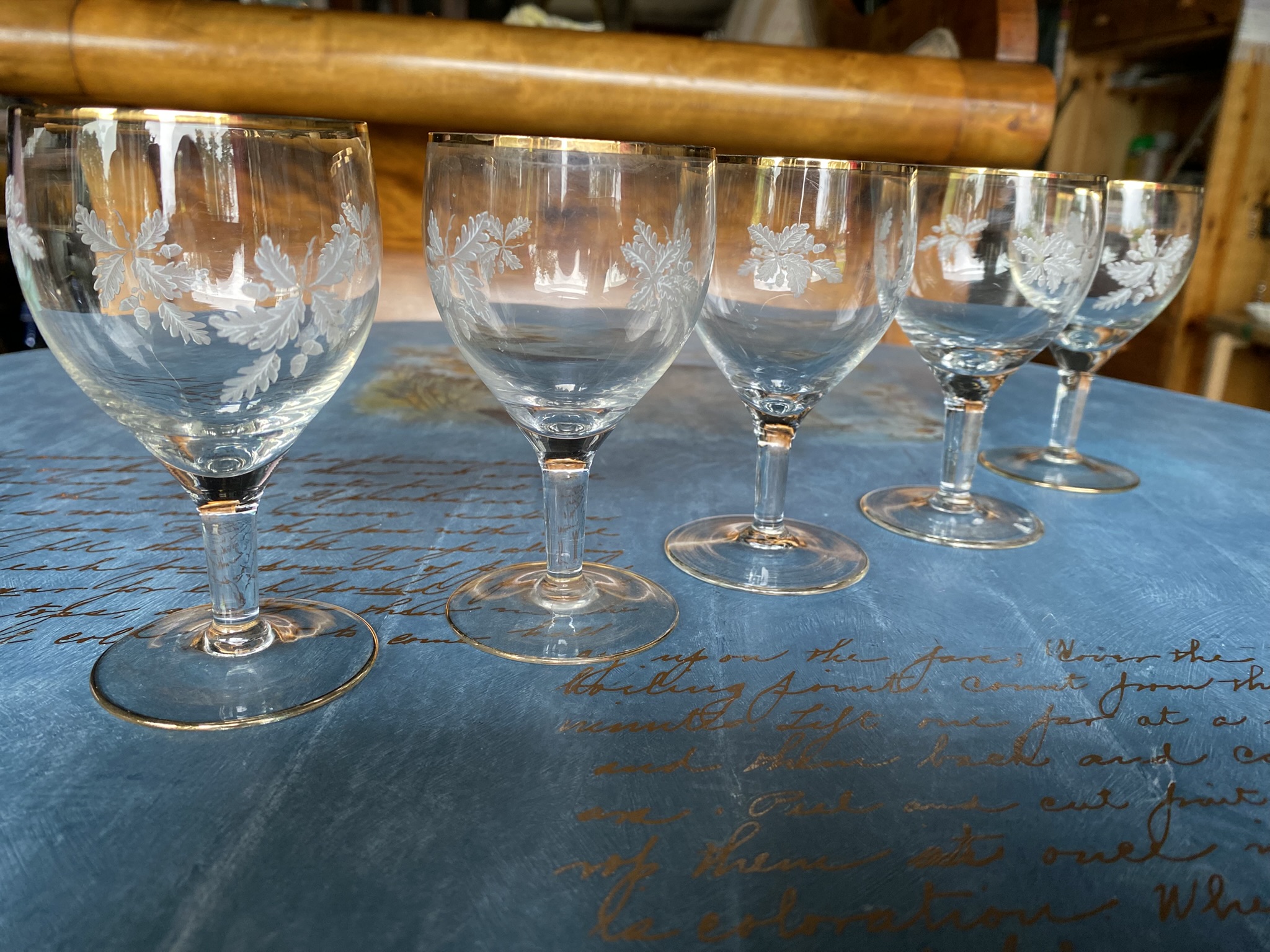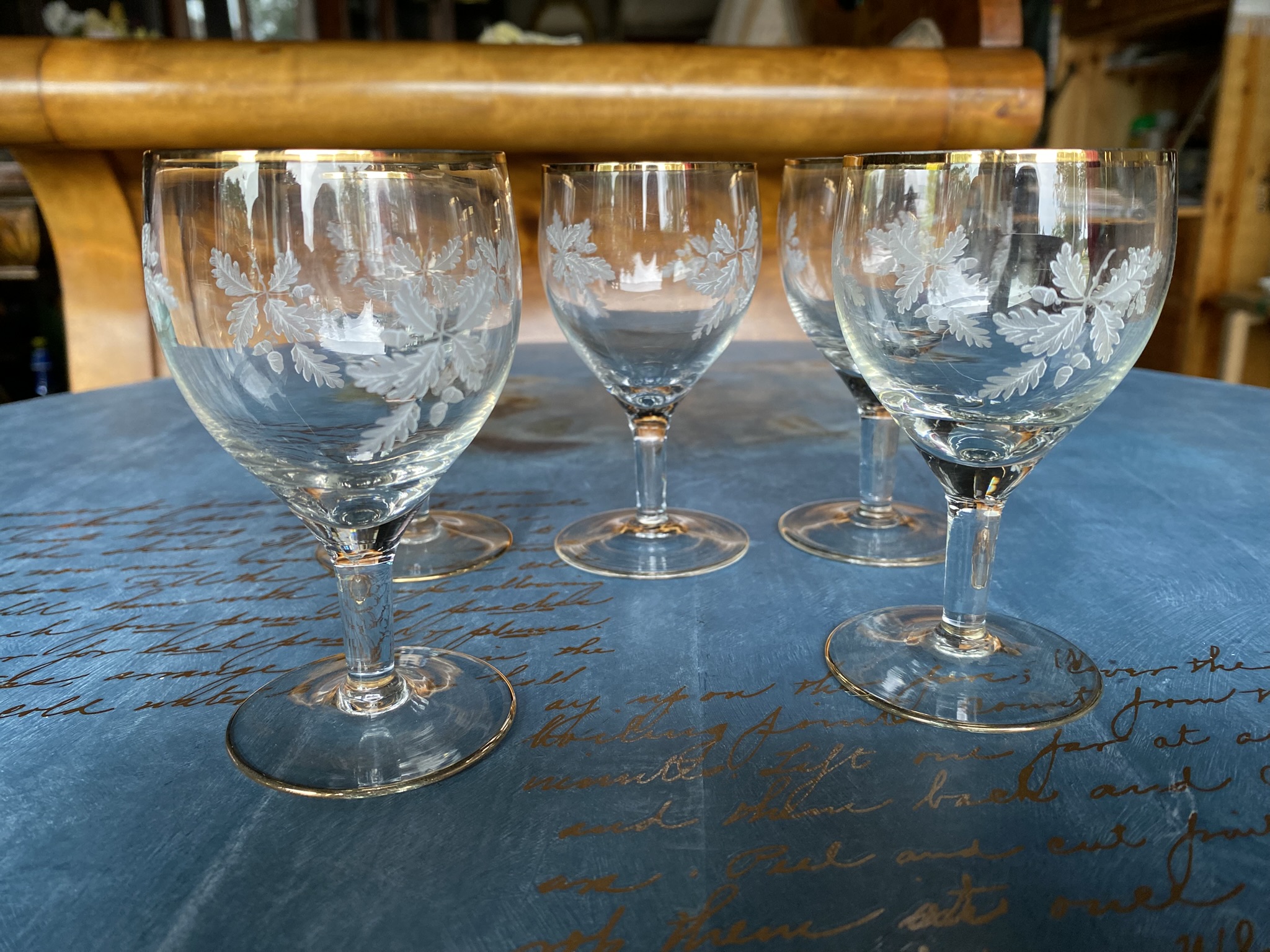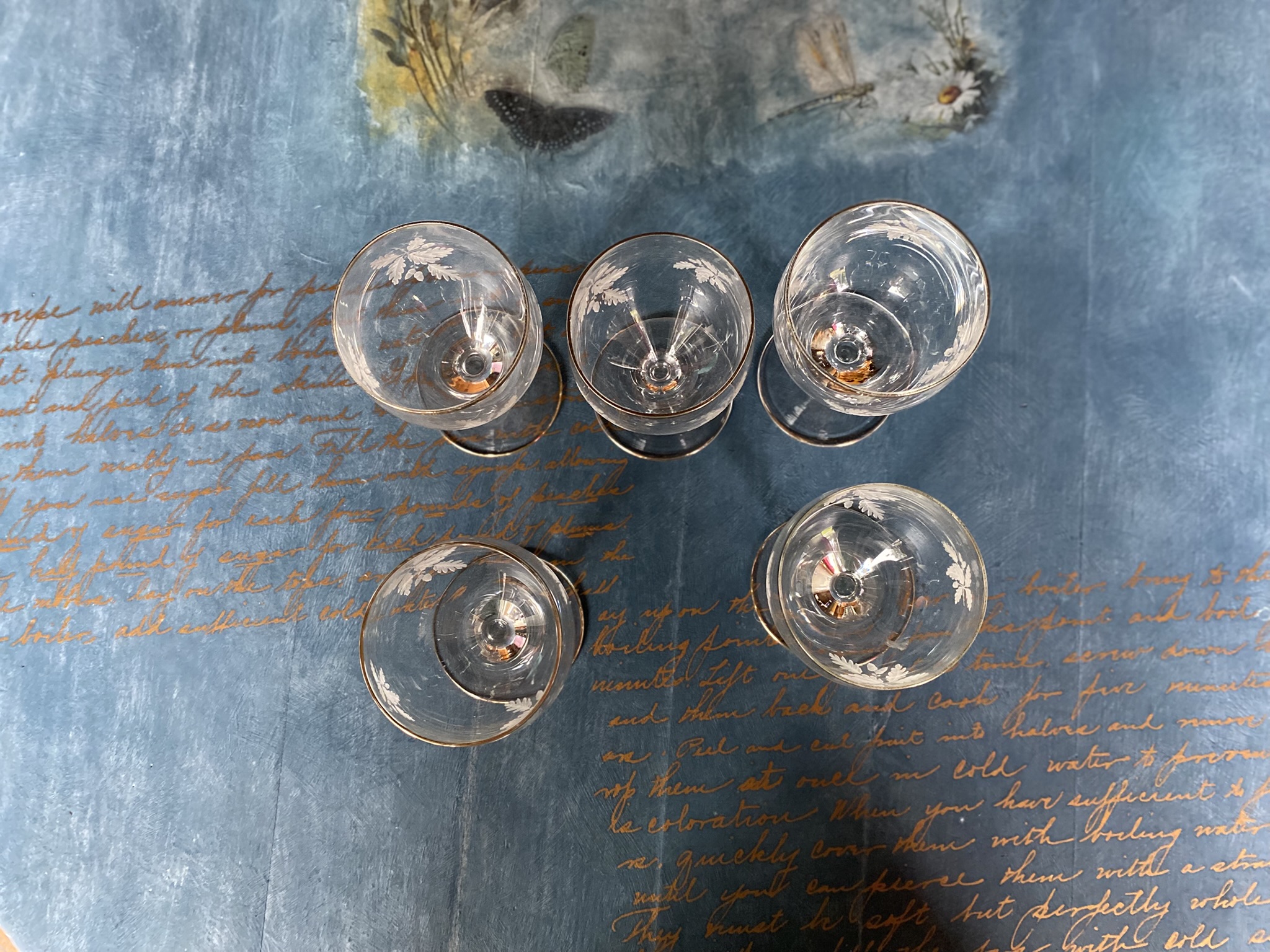Õrnad ja ajatu stiiliga vintage klaasid tammelehe ja tõru mustriga ning kuldse äärega. Sobivad ideaalselt magustoiduveini, šerri või likööri serveerimiseks – tõeline pilgupüüdja igal laual või vintage kollektsioonis.